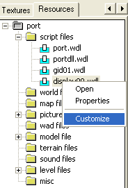 This window displays a list of all files and scripts in the game. You can display a script, or open the specified editor for a certain file type by clicking onto it. By pressing right on a file, a little pop-up window with Open and Properties will open. When you press right on a script also Customize will shown. Open: Opens the file in the Editor given by File>Preferences>Editor . Properties: Give you more information about the File Properties.