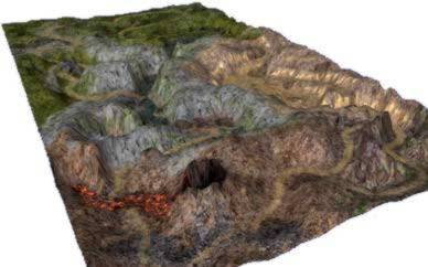 Due to the huge size of a terrain, it won't do just mapping a normal texture onto it. Even at the maximum recommended texture size of 2048x2048 the terrain would look blurry at close range. The simplest solution for this is adding small detail texture that blends a high resolution sand, stone, or grass structure over the first texture. If a terrain has a second skin, it is automatically used for a detail texture. An extension of this concept is using multiple detail textures for mapping patches of rock, grass, paths etc. onto different parts of the terrain. The mtlFX.c environment template uses a fixed function effect to blend an arbitrary number of textures on a terrain. Every texture must have a blending mask in its alpha channel. For using the template, include mtlFX.c to your script, and apply the fx_terraintex action or the mtl_terraintex material to your terrain. Passable terrains are used by the template scripts for water surfaces, in which actors can wade, swim, or dive. The physics engine calculates buoyancy and waves for objects that fall into the water. You can assign reflective water surfaces with wave motion to water terrains through the above mentioned Material Effects Library. The engine supports two types of terrain, unchunked or chunked. By default, terrain is chunked, unless the terrain_chunk variable is set to 0 or the terrain file name ends with '_n' (e.g. "nonchunked_n.hmp"). Unchunked terrain is rendered just like a model, and must not exceed a size of 128x128 vertices. C Chunked terrain its divided by the engine into square chunks that are stored in a memory cache, are separately clipped when outside the view frustum, and P are rendered in different resolution steps depending on their distance to the camera and the terrain_lod setting. This method allows for much faster terrain rendering and theoretically unlimited terrain size. The little catch is that chunked terrain can't be used for water physics . |